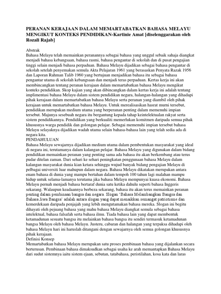 Peranan Kerajaan Dalam Memartabatkan Bahasa Melayu Mengikut Konteks Pendidikan Pdf